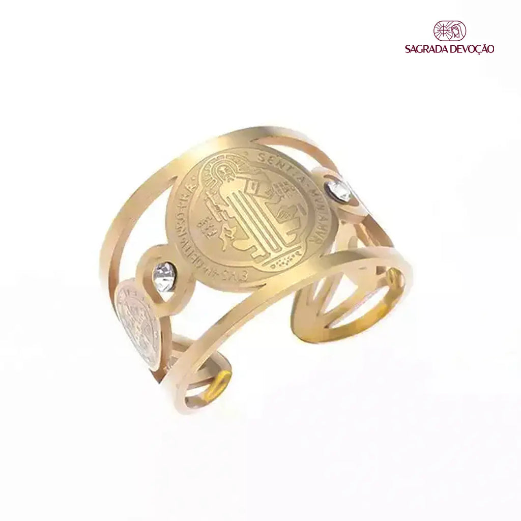 🙏 Leve consigo a força e a proteção de São Bento em um anel único e ajustável! ✨