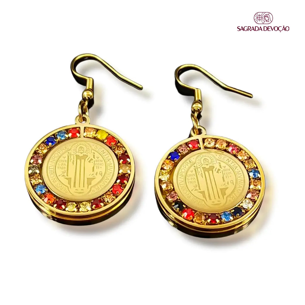 ✨ Expresse sua fé com sofisticação, proteção e beleza, com o Brinco São Bento com Zircônias Coloridas em Ouro 14K.