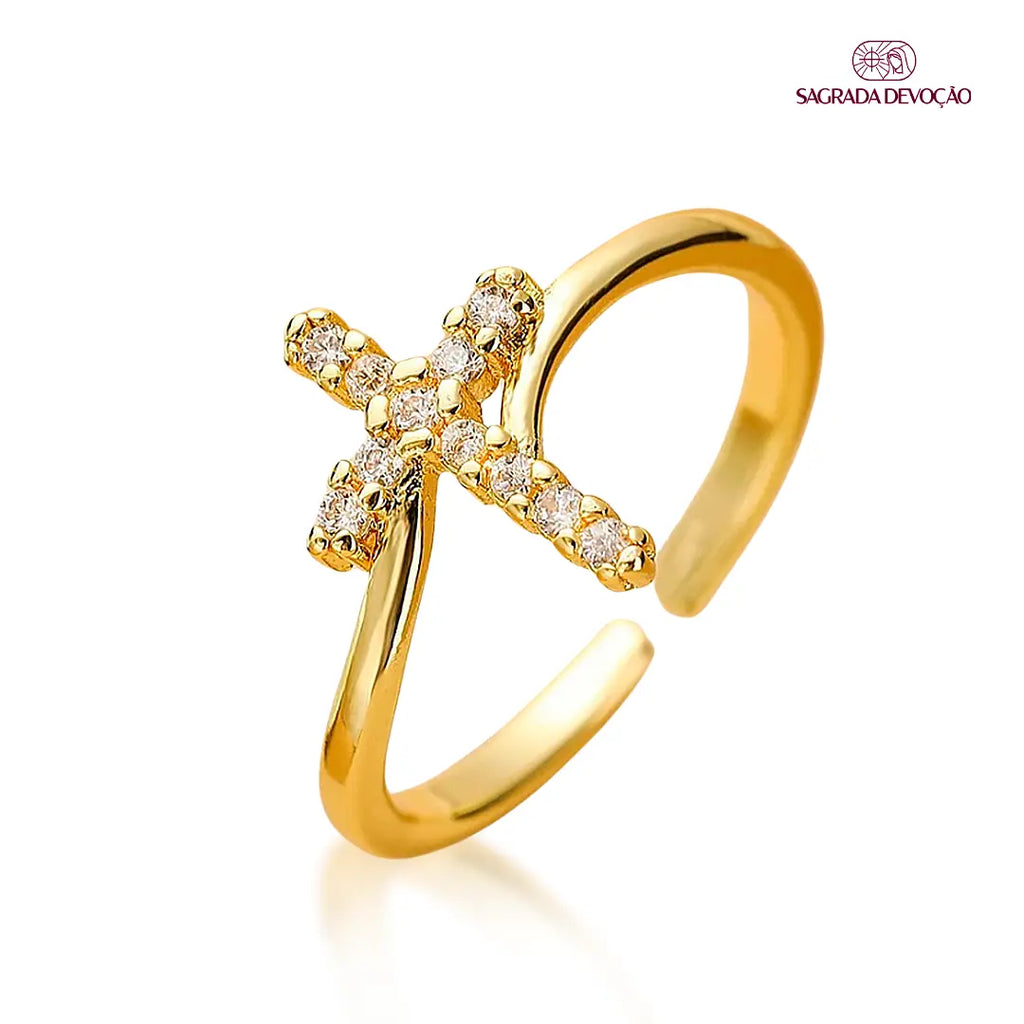✨ Anel de Cruz Luxo – Ouro – Ajustável ✨